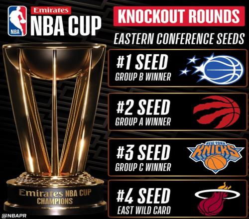 魔术一号种子,猛龙二号种子、尼克斯三号种子、热火四号种子,活塞作为东部第一的球队无缘杯赛八强也挺让人意外。