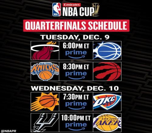 北京时间12月10日,NBA杯赛1/4决赛开打,魔术VS热火、猛龙VS尼克斯、太阳VS雷霆、马刺VS湖人。
