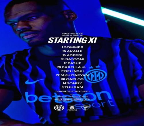 国米vs莱切:图拉姆领衔,博尼、迪乌夫、泽林斯基出战