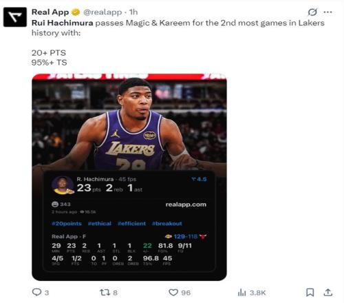 这场比赛后八村垒超越魔术师、贾巴尔成为湖人队史拿下20+真实命中率95%以上第二多的球员,队史第一是拜伦-斯科特4次。