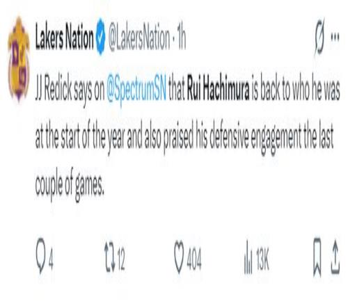 八村垒赛后接受采访,他盛赞了这个团队能看出他很不愿意离开LAL,他说道:我 要表扬我的教练,教练在会议上跟他们谈过了,让勒布朗、卢卡要多给队友球,他们也确实这样做了,他们总是接受教练的建议,所以我们能赢球,每个人都可以触球,每个人都能积极参与进攻,这才是篮球该有的样子。