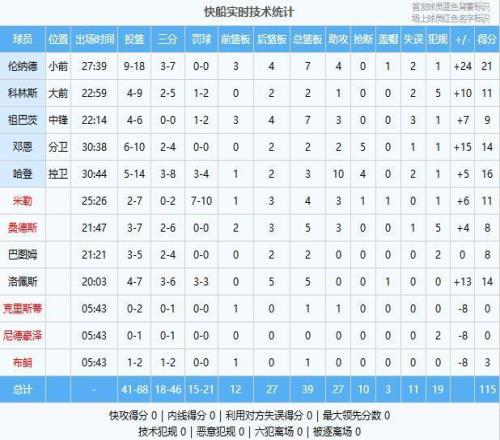 下场快船防守升级邓恩连续抢断反击快船一度将领先扩大到19分,而后爵士始终无法有效反击,三节结束后快船已经领先15分,末节上来,爵士无法打出追分高潮逆转无望,两队陆续换上替补阵容,最终快船115-103击败对手迎来三连胜。